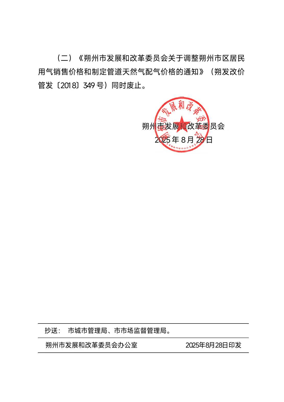 朔州市发展和改革委员会关于核定朔州市市区管道天然气销售价格的通知
