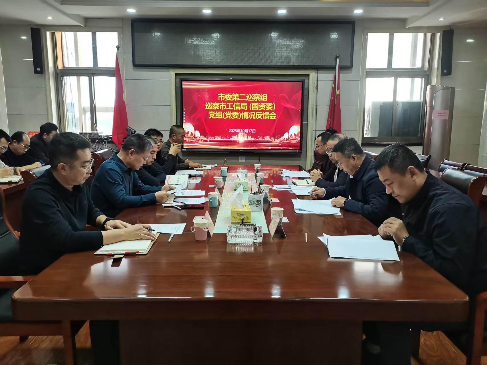 10月17日,市委第二巡察组对市工信局(国资委)党组(党委)巡察“回头看”反馈会召开。市委第二巡察组跟组领导、市纪委常委、监委委员贺海龙,市委第二巡察组组长李刚,成员解志强、刘亚斌,市工信局(国资委)副科级以上干部参加会议,会议由市工信局(国资委)党组(党委)书记、局长(主任)高明道主持。