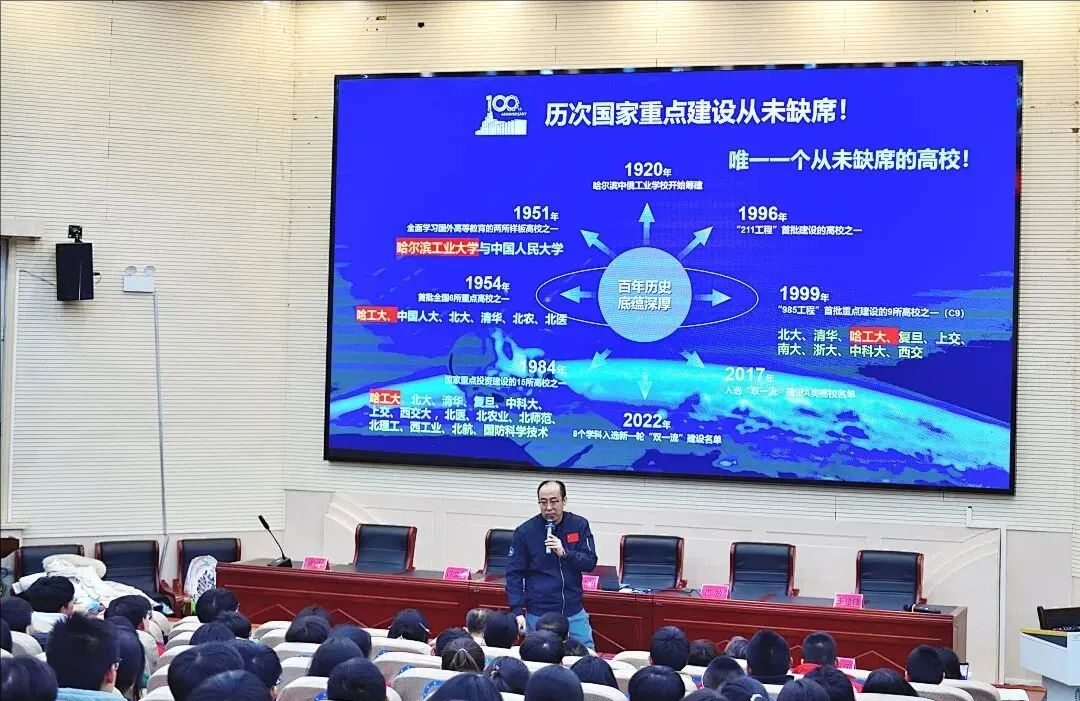 当大屏幕上呈现哈工大在航天探月、机器人、小卫星、高端装备制造等领域取得的一系列里程碑式成果时,报告厅内响起阵阵惊叹。哈工大“国之重器”的背后,不仅是科技实力的彰显,更是一代代哈工大人将个人理想融入国家需要的生动写照;这种一代代传承科研接力、一代代续写强国华章的精神,跨越时空化作榜样的力量,在现场一中学子们心中投下了一束“国之所需,心之所向”的梦想之光,指引着新时代一中学子,心向星辰、脚踏实地,以满怀的热忱勇毅奔赴与家国同行的美好未来。