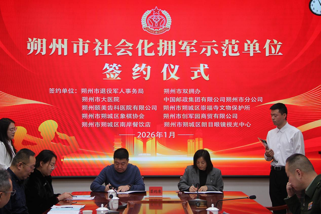 为贯彻落实新修订的《山西省军人抚恤优待实施办法》,进一步深化拥军优属工作,提升社会化拥军水平,在全社会营造尊崇军人职业、尊重退役军人的浓厚氛围,1月13日,朔州市第三批社会化拥军示范单位签约仪式在市退役军人事务局会议室举行。